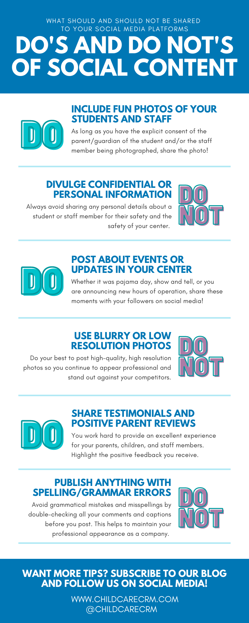 When you deliver content that engages and excites prospective families, you are grabbing their attention long enough to tell them how you can resolve their search for quality childcare and why your center is the perfect place for their child(ren). Try posting things that talk about how you offer something different from your competition or discuss ways that your center can make their life easier. For more ideas on what to post, check out this downloadable infographic!