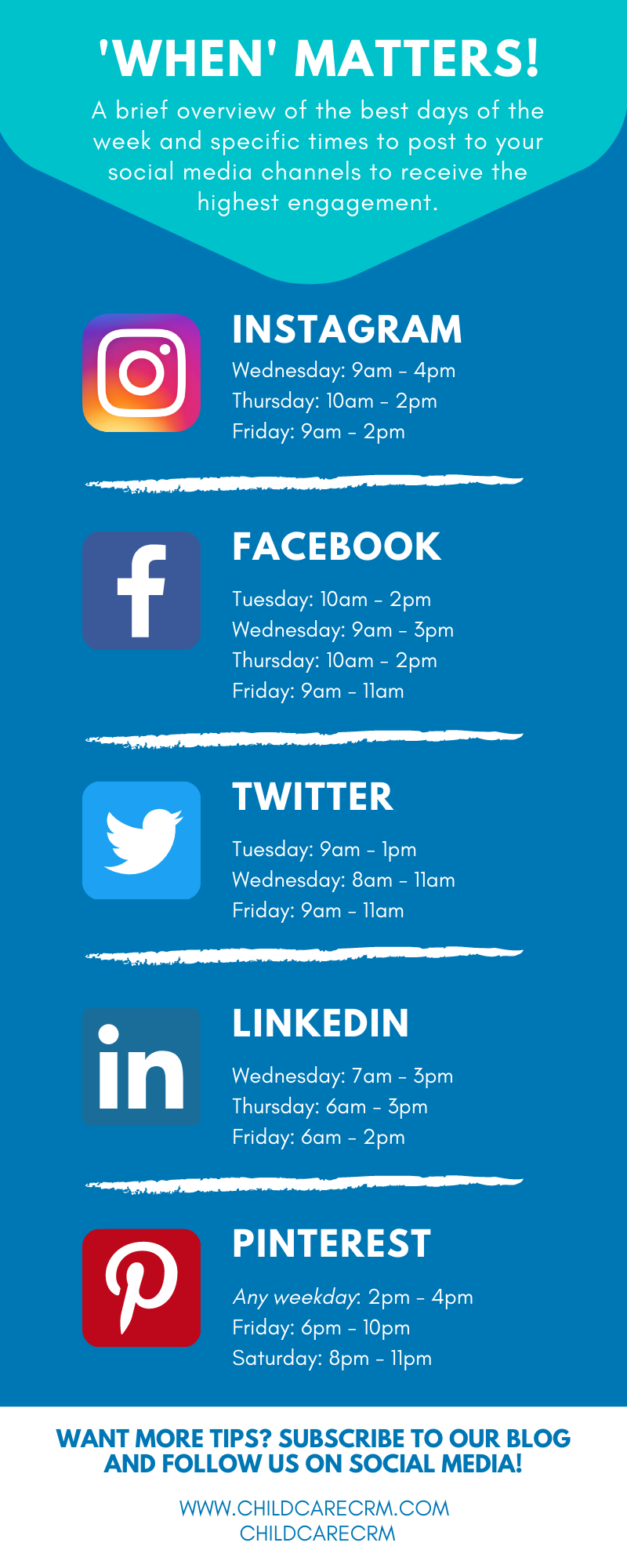 When you post that photo of little Timmy enjoying snack time with his teacher to Instagram, your current parents and your prospective parents start to see your center as a secure, happy place for their child. When you continue to post real photos of what your center looks like, how happy the kids are, and why the teachers love working there- you not only stay top of mind and become more noticeable to parents, you gain reputability and build relationships sometimes before you’ve even met them. Quality content and consistent updates are the keys to social media success. At a minimum, try to post 3 times per week to your Facebook page. Check out this infographic for how often to post on each platform and discover the right times to update your social media followers!